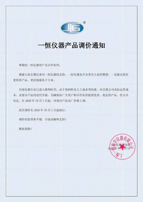 大家好,接一恒廠里通知,十月一號后,一恒產(chǎn)品正式調(diào)價, 如有未完成訂單,請盡快在國慶節(jié)前完成,以免給您造成預(yù)算不足,耽誤設(shè)備的采購