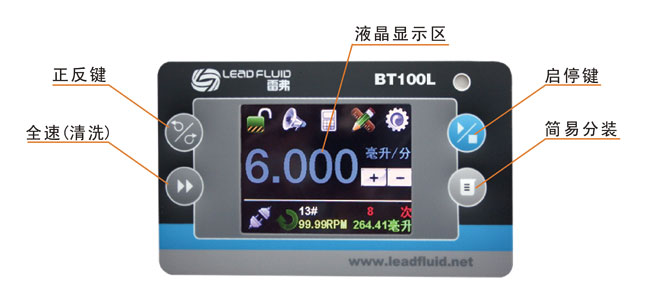 BT100L流量型智能蠕動(dòng)泵流量范圍0.00011~720毫升/分鐘。采用彩色液晶和觸摸屏技術(shù),操作界面簡(jiǎn)單,直觀,明了。主要適用于精準(zhǔn)流量傳輸控制,用戶可以根據(jù)自己的需要流量顯示,流量控制,流量累計(jì)。同時(shí)本產(chǎn)品實(shí)現(xiàn)了重復(fù)定時(shí)定量傳輸。適用于精確計(jì)量和定量給料,精度最高可達(dá)0.5%,為了減小不必要的蠕動(dòng)泵噪音,采用了智能溫控技術(shù)。在RS485通訊中,因?yàn)椴捎昧薓ODBUS協(xié)議,更易于與其他控制設(shè)備如計(jì)算機(jī),人機(jī)界面,PLC等連接。