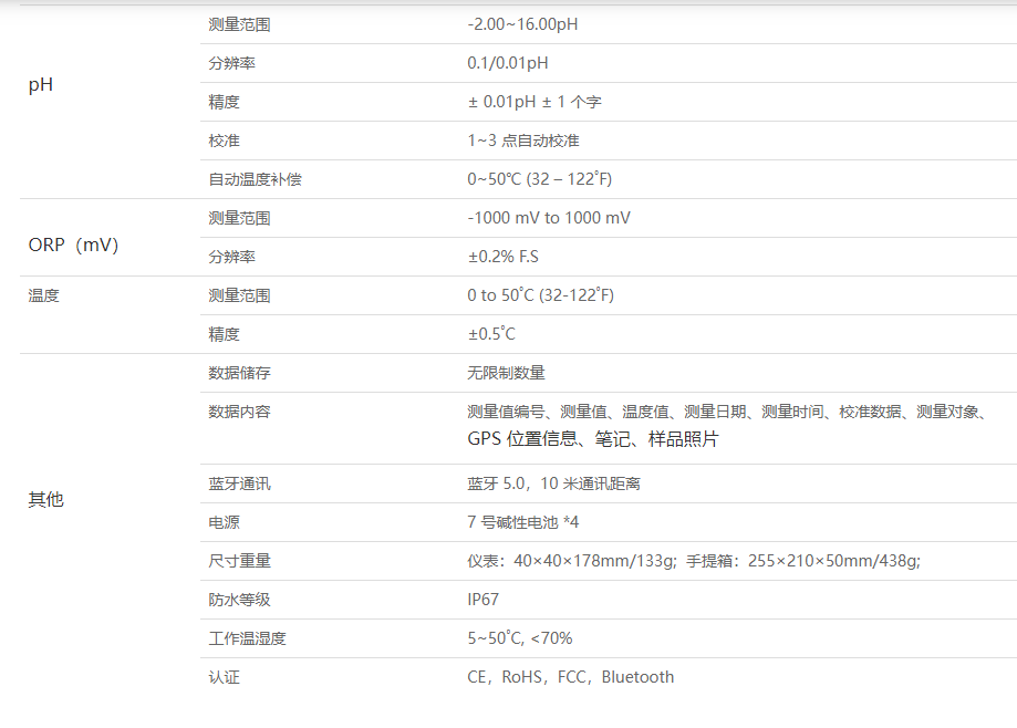 測量范圍:-2 to 16.00 pH,0 to 50˚C (32-122˚F);精度:±0.01pH,±0.5˚C